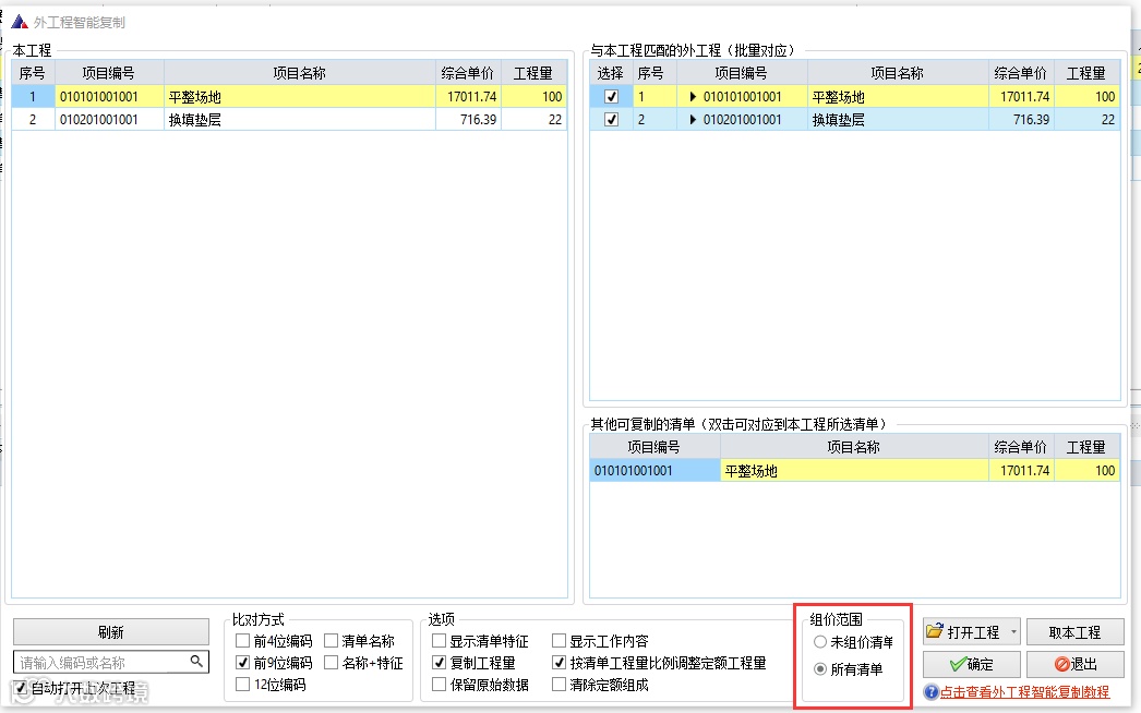 1、外工程复制、智能复制增加组价范围,用户可根据选择的组价范围进行复制