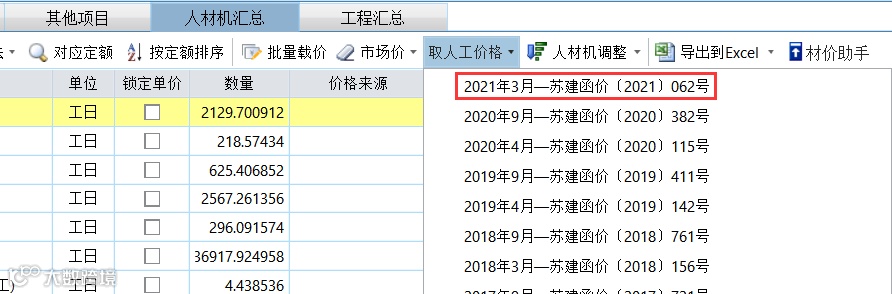 在软件【人才机汇总】界面的【取人工价格】功能中,可直接选择文号,对人工价格按最新工资指导价调整。