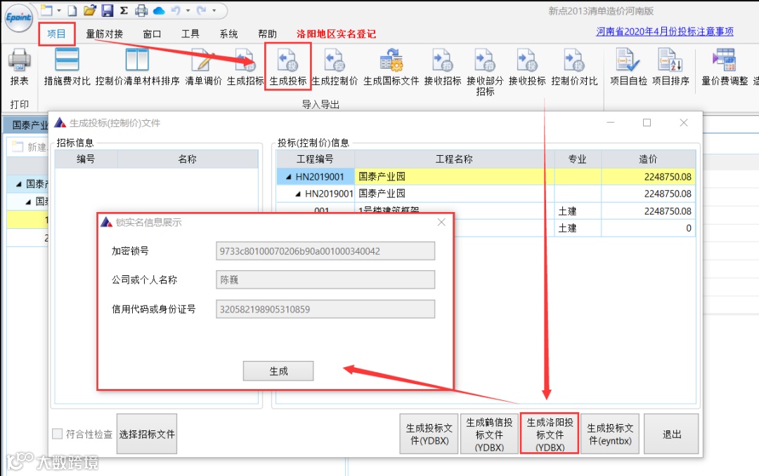 4、造价软件加密锁完成实名信息登记后,即可通过【生成洛阳投标文件】按钮生成投标文件,软件将弹出【锁实名信息展示】窗口,确认信息无误后,点击【生成】即可生成洛阳地区电子投标文件。