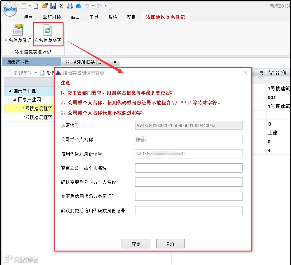 6、电脑USB插上已完成实名信息登记的造价加密锁,点击【实名信息变更】,在弹出的【洛阳实名制信息变更】窗口中,可确认该造价加密锁已登记的实名信息,确认无误后填写变更后名称、信用代码或身份证号等信息,再点击【变更】即可完成实名制信息变更。(需注意,应洛建[2020] 60号文通知规定,一把造价加密锁的实名信息每年最多变更2次,请各位用户登记或变更前谨慎检查实名信息无误后再行登记变更。)