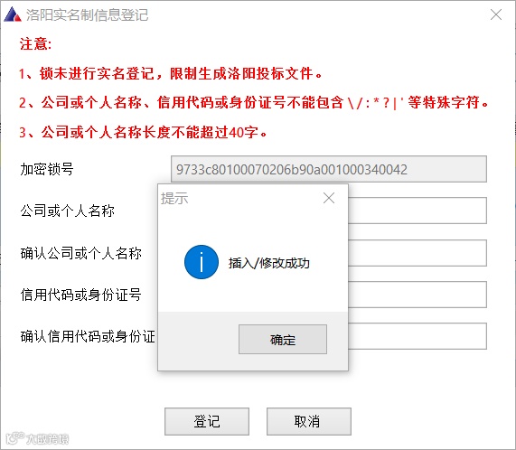 3、确认名称、代码或身份证号无误后,点击【登记】按钮即完成实名信息登记,软件提示【插入/修改成功】,即完成洛阳实名制信息登记。
