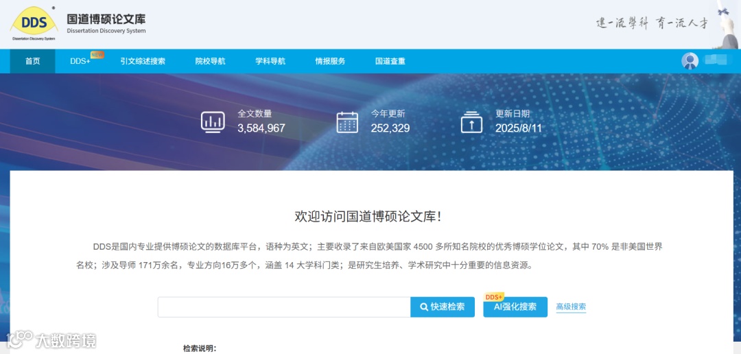 国道博硕论文库 (DDS)主要收录了来自世界70多个国家或地区、4500多所知名院校的优秀博硕学位论文,其中70%是非美国世界名校;涉及导师171万余名,专业方向16万多个,引文及引文综述1.4亿条,涵盖14大学科门类;英文论文数量已达350余万篇,是学术研究中十分重要的信息资源。