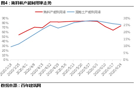 2020年1-6月全国新开工面积累计同比下降7.6%,降幅较上月收窄5.2个百分点,单月新开工面积同比增长8.9%。新开工单月较上月增长扩大,反应地产需求韧性,在地产销售快速转好的基础上,短期预计新开工累计降幅将继续收窄。另外,从水泥企业熟料产能利用率和混凝土产能利用率走势来看,二季度恢复情况较好,4、5月份甚至超过去年同期水平,而6月份南方多地梅雨天气影响产能利用率均有所下降,三季度随着梅雨季节过去,市场逐步复苏,预计下半年水泥需求仍呈现较强韧性。