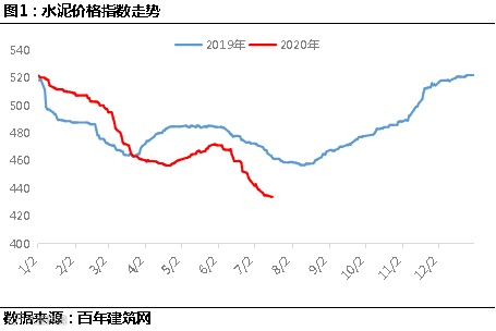 截至6月28日水泥价格指数为445.44,较1月初下跌76.62,上半年整体水泥价格指数呈现高开低走的态势。一季度属于季节性淡季,加上今年受疫情影响,市场恢复推迟近一个月时间,水泥价格指数从522.06下跌至456.87,跌幅达12.49%。4-5月份由于疫情期间积压的需求集中释放,水泥价格指数回升至472.48,涨幅3.4%。6月份因多地进入梅雨季,甚至部分地区出现洪涝灾害,水泥需求大幅下滑,水泥价格指数下跌至445.44,较去年同期低27.37。