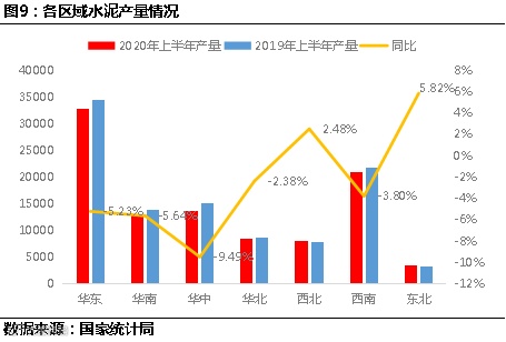 从各区域上半年水泥产量同比下降最多是华中区域,同比下降9.49%,主要因为华中湖北地区上半年受疫情影响严重,水泥产量大幅下降所致。其中同比增长的区域是东北和西北区域,增长5.82%和2.48%,因东北和西北地区受疫情影响相对较小,而3月过后政府鼓励水泥上下游企业积极复工复产,从而促进东北和西北地区上半年水泥产量超过去年同期水平。其他区域因疫情影响,产量同比去年均有不同程度下降。
