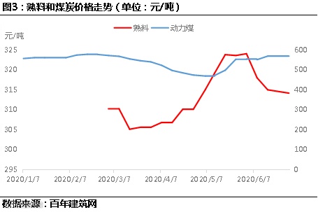 上半年熟料和动力煤价格均先抑后扬,一季度动力煤价格大幅下跌,累计跌幅达109元/吨。今年上半年动力煤均价同比去年下跌70元/吨,由于动力煤是熟料煅烧主要原燃材料之一,因此动力煤价格下跌,也是影响一季度熟料均价大幅下跌30元/吨的原因之一。二季度由于市场需求提升,加上动力煤价格止跌回升,熟料价格有所提升,累计涨幅达20元/吨,而6月份因多地雨水天气和洪涝灾害影响市场需求大幅下滑,熟料均价也随之下跌10元/吨。