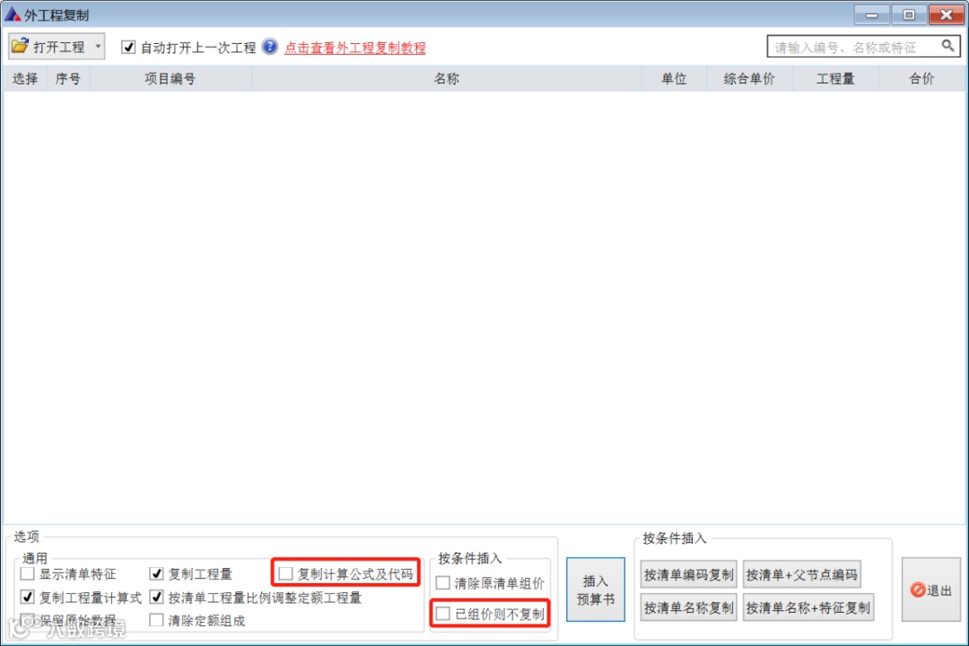 4.2 外工程复制新增已组价则不复制选项、复制计算公式及代码功能。