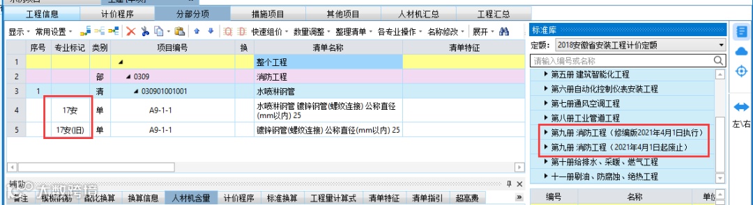 安装定额库中消防工程册对新老定额做了区分,并且在专业标记列对同样编码的消防定额做了区分。
