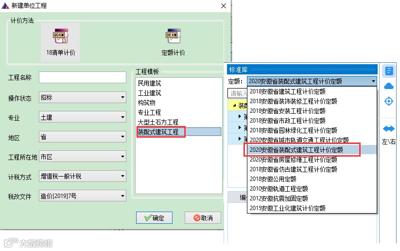 新建土建专业的单位工程时,可以选择装配式建筑工程模板,模板中各费率按照文件给出默认值。标准定额库中也已增加2020安徽省装配式建筑工程计价定额。