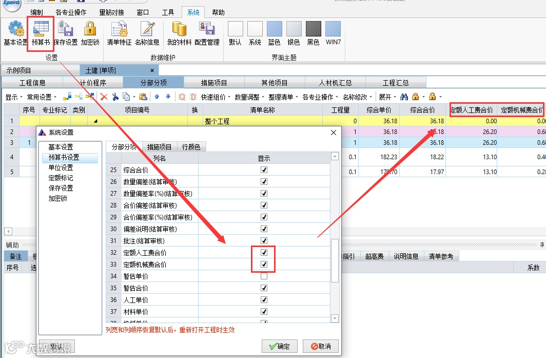 【操作步骤】:定额人工费、定额机械费两列默认不展示,如果需要,点击【预算书】-【定额人工费合价】、【定额机械费合价】勾选显示即可。