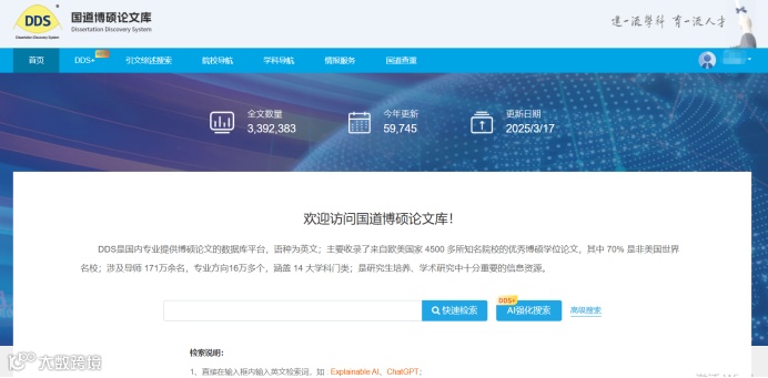 国道博硕论文库 (DDS)主要收录了来自世界70多个国家或地区、4500多所知名院校的优秀博硕学位论文,其中70%是非美国世界名校;涉及导师151万余名,专业方向11万多个,引文及引文综述1.4亿条,涵盖14大学科门类;英文论文数量已达336余万篇,是学术研究中十分重要的信息资源。