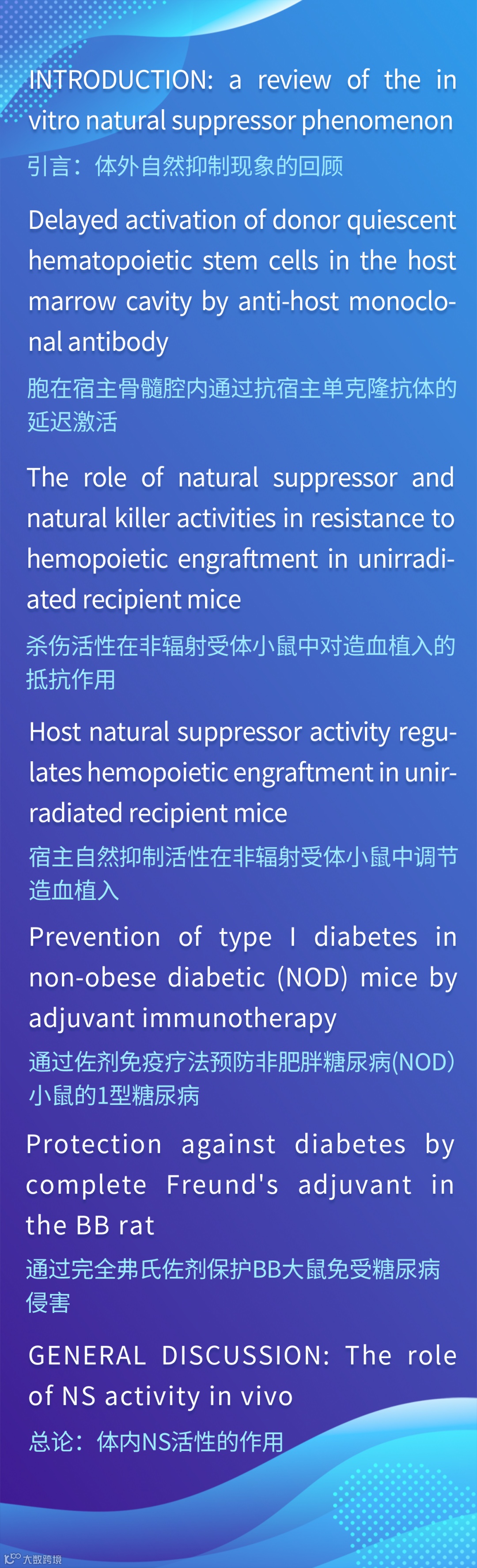 此外,他还发现给予NOD小鼠完全弗氏佐剂(CFA)可以预防糖尿病的发展,这可能与NSA的增加有关,因为糖尿病是T细胞依赖的,而T细胞受到NSA的抑制。这些发现不仅强调了NSA在免疫调节中的重要性,也揭示了造血与免疫耐受之间的联系。