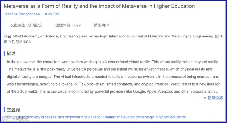 希腊开放大学教授Stylianos Mystakidis的一篇已发表文献中提到:“元宇宙是一个由持久的多用户平台中的社交、网络沉浸式环境组成的互联网络。”
