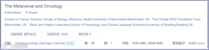 发表在Clinical oncology (Springer, Internet) 期刊的文章《The Metaverse and Oncology》中表示:“运用元宇宙可以具体感受癌症与周围组织的对比;临床医生可以更详细地观察病变;患者可以在元宇宙预约世界任何地方的医学会诊等。”