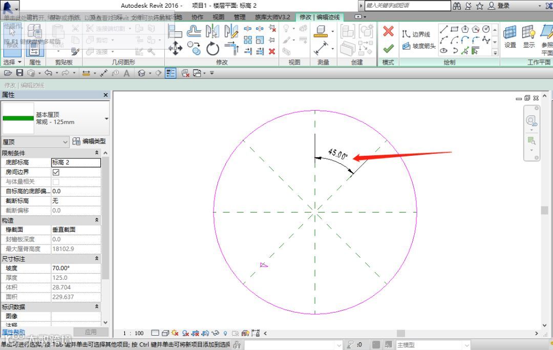 接着,我们点击坡度箭头按钮沿着参照平面的方向绘制8个坡度箭头。绘制完成后,将原本的迹线屋顶取消定义坡度,防止两者发生冲突(如图)。