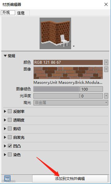 由于Navisworks2016没有新建材质这个按钮,所以我们可以直接在材质浏览器下方的材质库中找到所需的材质,双击会打开一个材质编辑器对话框,点击对话框下方的“添加到文档并编辑”按钮,就能把所需要的材质添加到上方文档材质中。接着,我们在上方找到刚刚添加的材质,单击鼠标右键,选择指定给当前选择对象。(如下图)