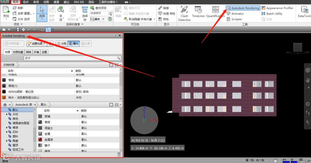 先点击常用选项卡下“Autodesk Rendering”按钮,类似于Revit中的材质浏览器(如下图)。