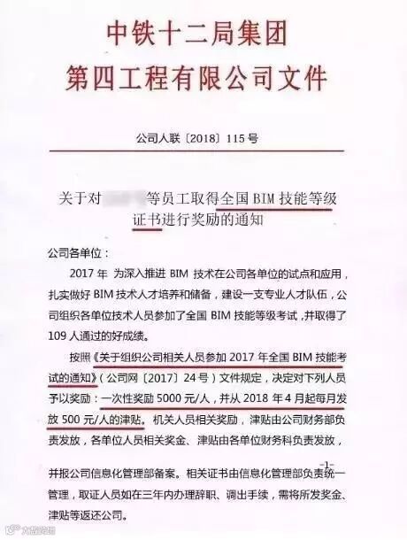 目前,国内众多大型项目招标文件中均有全国BIM等级考试持证人员数量要求,已有多家大型国有建筑单位,对通过全国BIM等级考试的员工进行补助。