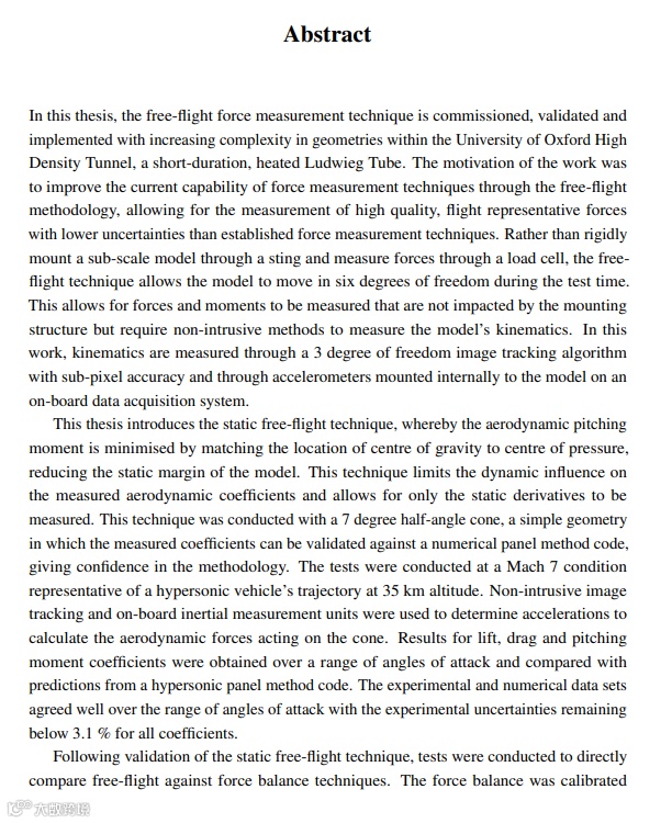 《Force measurement techniques in short duration hypersonic facilities(短时间高超音速设施中的力测量技术)》这篇论文研究了使用自由飞行技术改进力测量技术,以更精确地测量气动力。