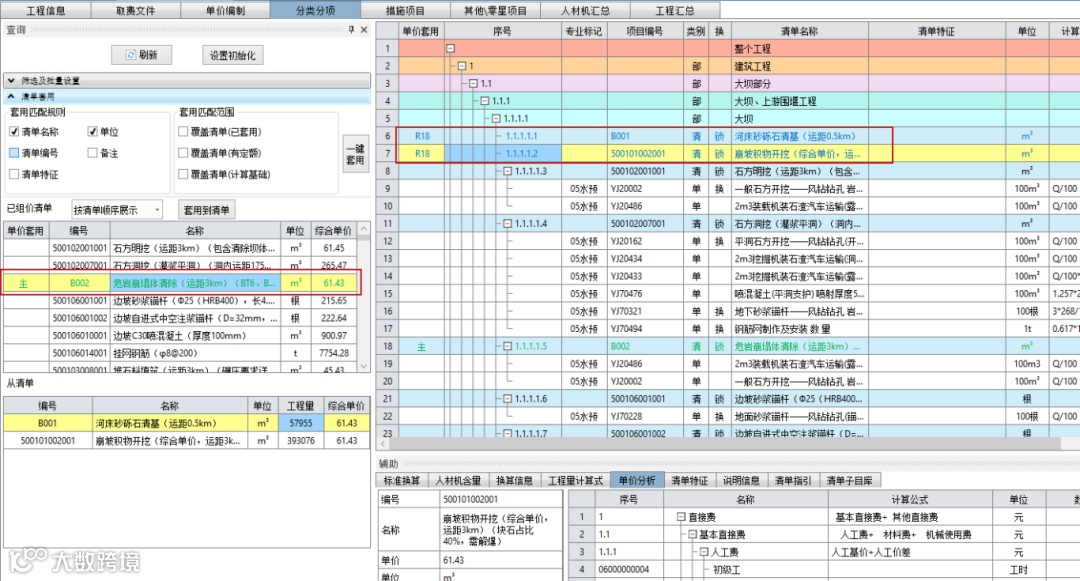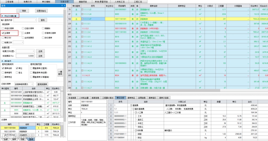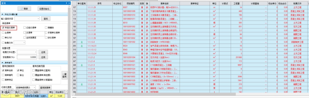 接收完招标清单后,在查询页签中设置套用匹配规则以及匹配范围,点击【一键套用】,使所有重复清单建立关联关系。