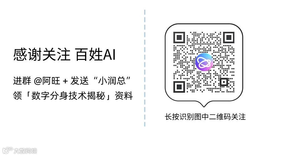 想要了解「小润总」数字分身技术?想要打造同款数字分身?阅读本周推文《揭秘「小润总」数字分身背后的技术》,也可扫码加入 百姓AI 社群,获取 Chato 产品介绍,解锁更多 AI 应用模式!
