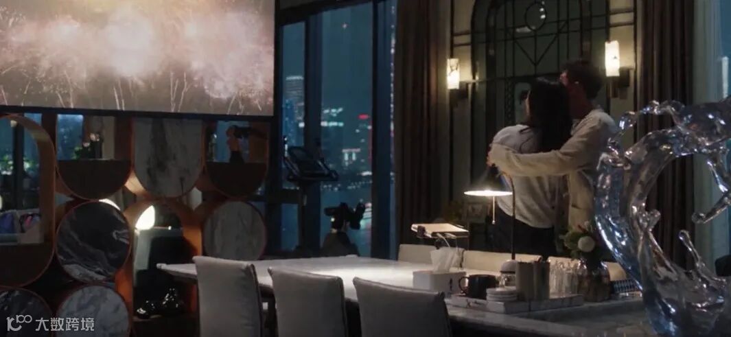 比如顾佳在剧中的房子,开放式厨房、中岛、餐桌组成了3重交流空间,整个社交餐厅的占地比例是整个住宅中最大的。