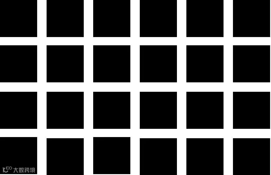 眼睛的侧抑制现象,导致了视错觉经典案例——赫曼方格的产生,当人眼盯着线条交叉处的某一个白点时,会发现其他部分的交叉点会闪现出灰色或者黑色。