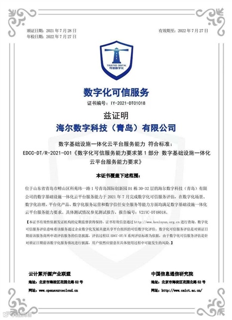 数字化可信服务的认可,也验证了卡奥斯COSMOPlat数字化产品、解决方案以及服务能力,满足可信云领域《数字化可信服务能力要求》标准在三维可信、六大能力的评估要求,为企业数字化转型提供可信服务,做到“可信任,共未来”。