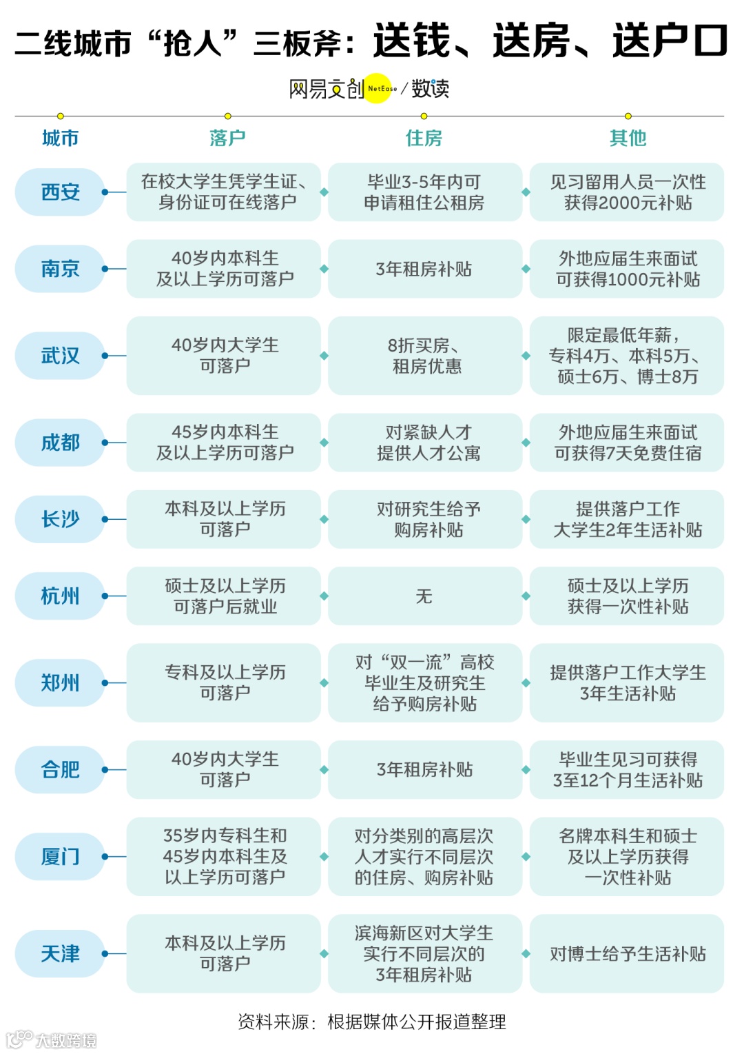 从 2017 年起,以武汉、西安为代表的二线城市,纷纷推出吸引人才的新政,通过放宽落户门槛、提供住房补贴等方式来吸引大学生落户就业。