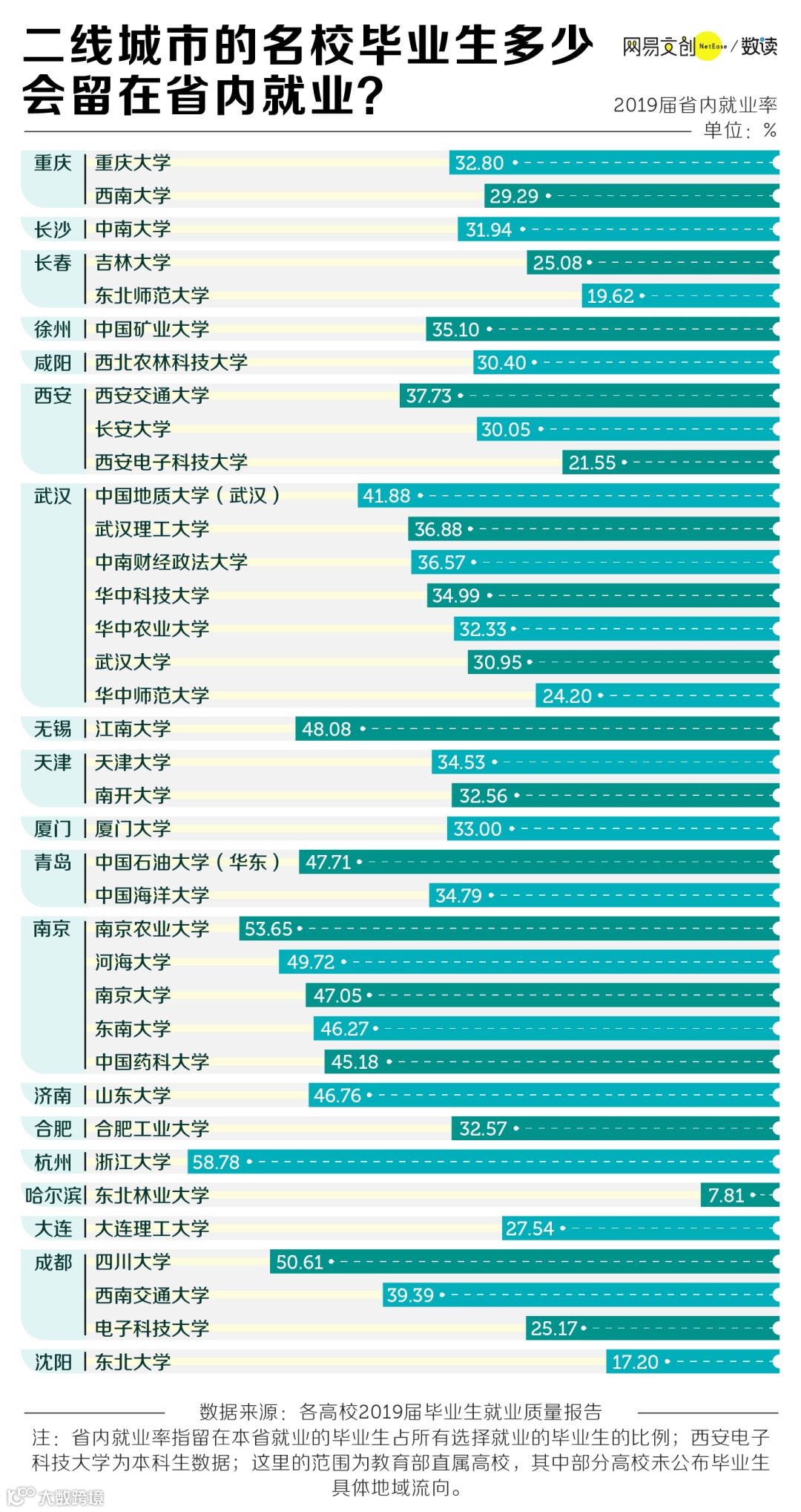 在新一线城市中,西安、重庆、天津等地的名校都只有 30% 左右的毕业生选择留在本省(市)内工作。相比之下,杭州、南京等江浙沪地区的情况就好了不少,毕业生更愿意留下。