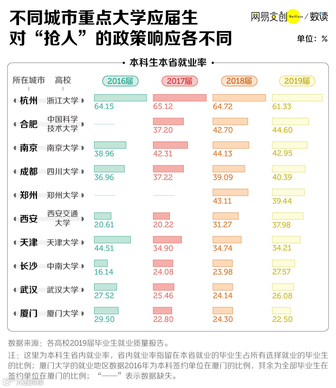 因此,我们抽样了一些二线城市代表大学的就业质量报告。通过对比“抢人大战”开始前后的省内就业率,可以看到并不是所有毕业生都对“抢人”政策感兴趣。