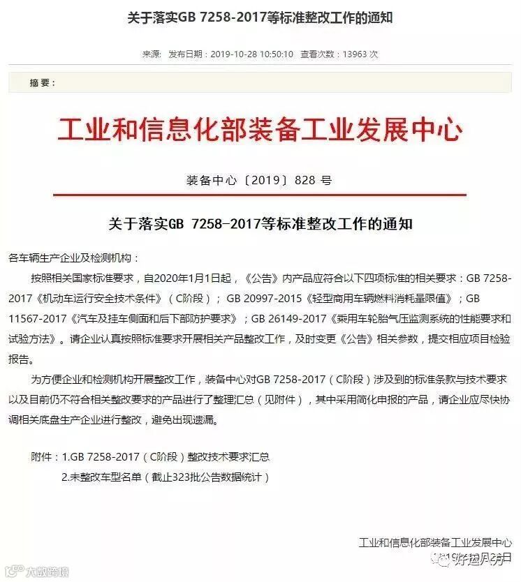 10月28日,工业和信息化部装备工业发展中心下发《关于落实GB 7258-2017等标准整改工作的通知》。