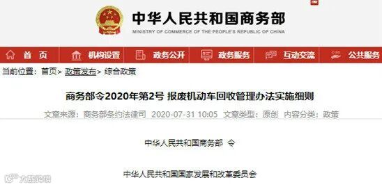 7月31日,商务部正式公布《报废机动车回收管理办法实施细则》,该《细则》将于2020年9月1日起施行。