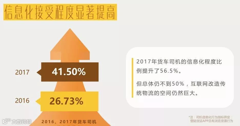 2017年起,互联网改造传统物流的速度是很快的,百分之40的司机已经信息化,互联网的便捷便利帮助到了他们,但这个比例是远远不够的,接下来需要呼吁更多的司机朋友使用互联网物流来帮助日常生活和工作。