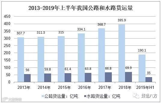2019年上半年,我国交通行业完成营业性货运量245.8亿吨,同比增长5.9%,保持在5%以上的较快增长水平。其中,公路完成货运量190.1亿吨、增长5.7%,水路完成货运量35.0亿吨、增长7.2%。