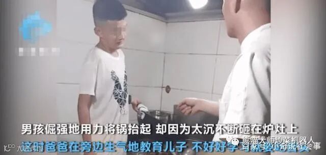 视频中,当父亲让男孩一手拿着笔,一手拿着锅,很明显,男孩拿锅的那只手非常吃力,单手抓锅很难抓起来。而后厨的辛苦却远不止这些。