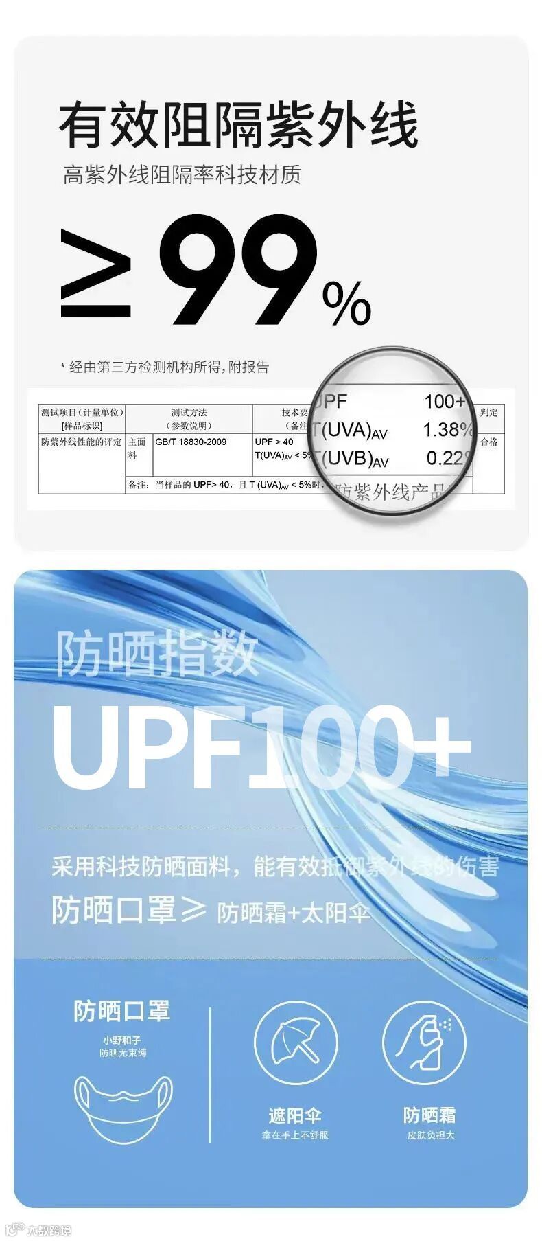 它的防晒值可以达到UPF100+ 有效阻隔99%紫外线