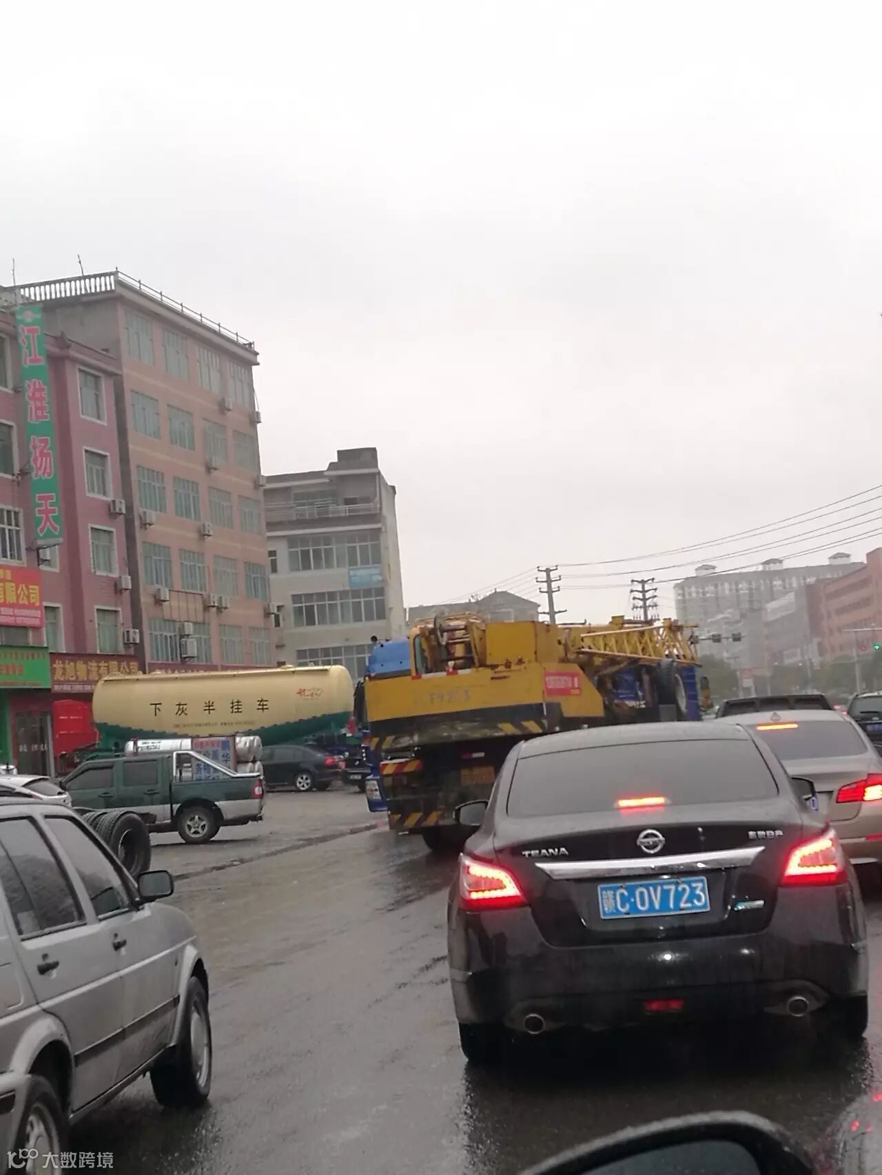 *挤着等红灯的卡车与轿车