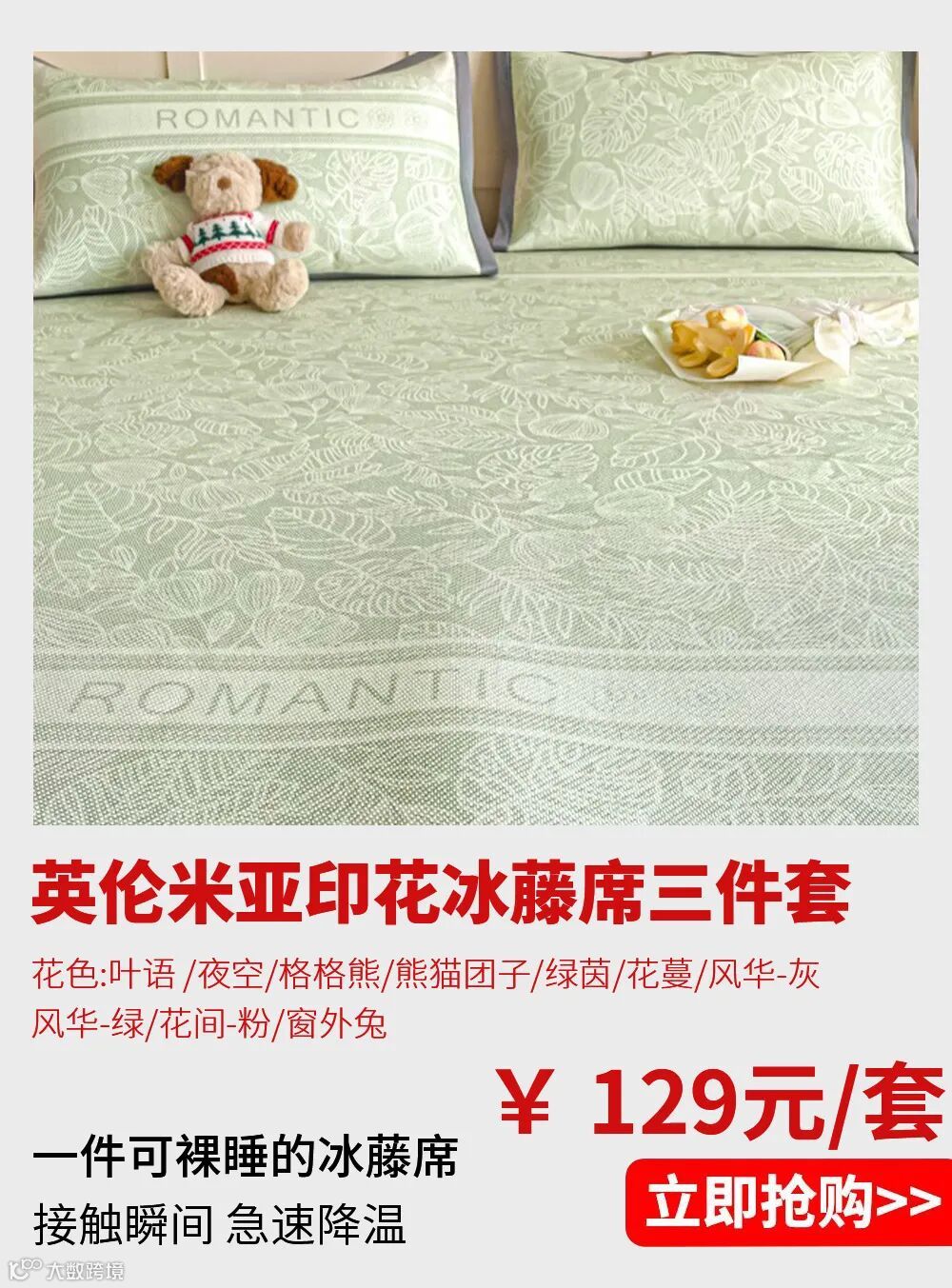 英伦米亚印花冰藤席三件套打破传统材质,选用科技凉感冰丝材料编织。能给你带来整夜持续凉感!