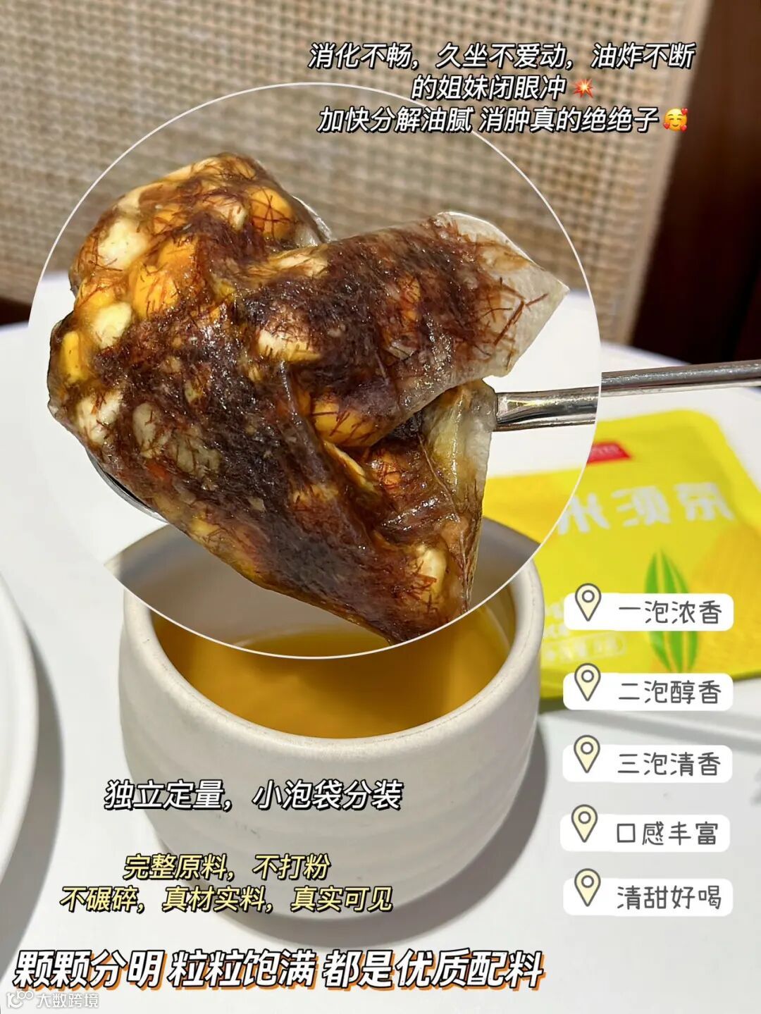 饮用方便,直接那一包丢杯子里,热水泡个3分钟就好啦!