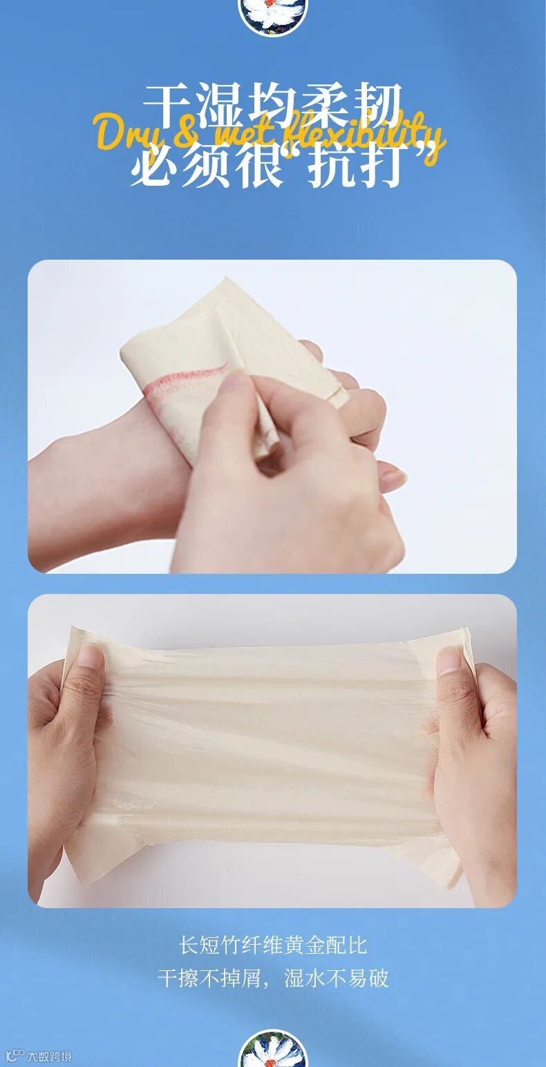 竹源品质优良,造出的纸巾细腻柔韧。不留纸屑残留!柔性达到行业标准的10倍!