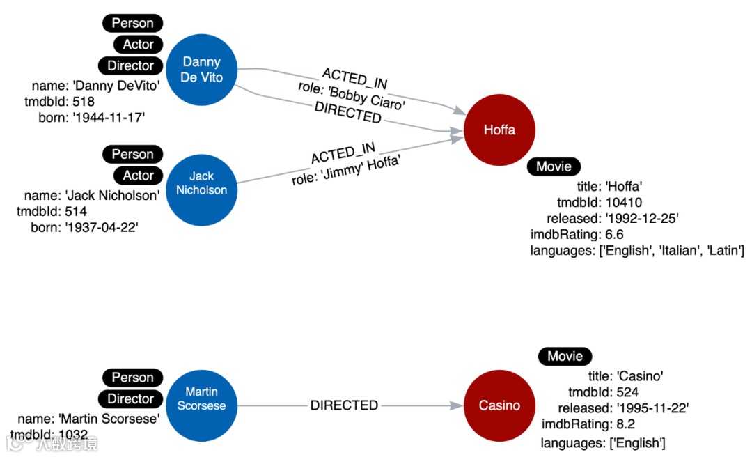 数据去重:很多节点共有的属性值抽取成新的节点,减少数据冗余存储。比如下图(a)中,Movie节点的languages属性列表有重复,可以将其列表项抽取成新的节点,如图(b)所示。