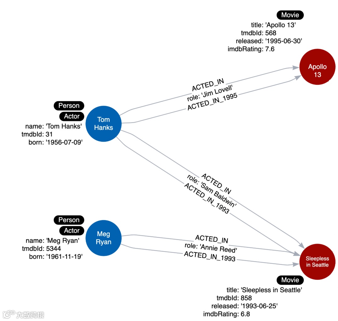 关系细化:如果要加快关系查询,可以把关系拼接上属性值作为一个细化关系。比如下图中的ACTED_IN关系,原本有year和role两个属性,如果要查询year:1995的ACTED_IN关系,需要扫描所有ACTED_IN然后查看year属性是否为1995,效率很低。将“ACTED_IN”拼接year的属性值作为细化关系,查询某个年份的ACTED_IN就不必全部扫描了。