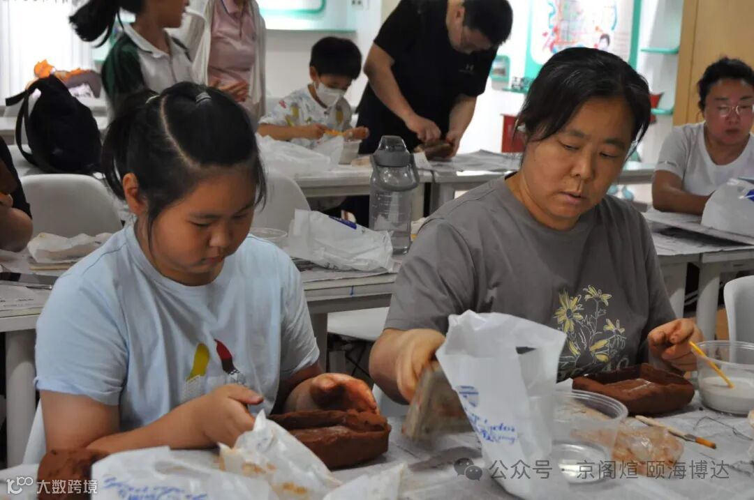 活动现场,在专业老师的指导下,参与活动的大朋友和小朋友们首先学习了红船精神的历史背景与深远意义,随后,大家纷纷拿起陶泥,开始尝试制作融入红船元素的瓦当。从捏泥、塑形、做“模范”到刻绘图案,每一步都凝聚着大家的创意与汗水。小朋友们在家长的陪伴下,兴奋地参与其中,体验到了传统文化的独特魅力。现场气氛热烈而温馨,不时传来欢声笑语。