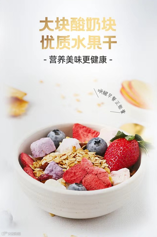 配料有燕麦脆、脱水苹果粒、芒果干、葡萄干、蔓越莓干、冻干草莓片、椰子片、冻干草莓酸奶块、冻干蓝莓酸奶块、冻干黄桃酸奶块。