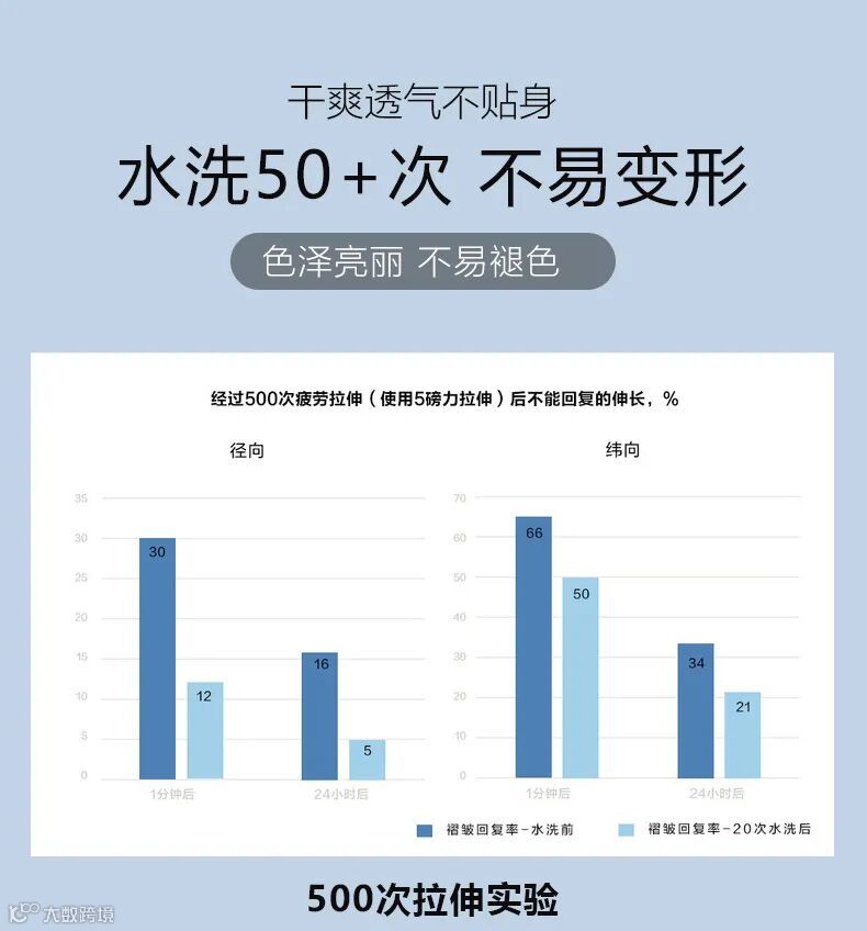 经过50次机洗+500次拉伸试验证实,面料防皱、防变形效果满分💯。