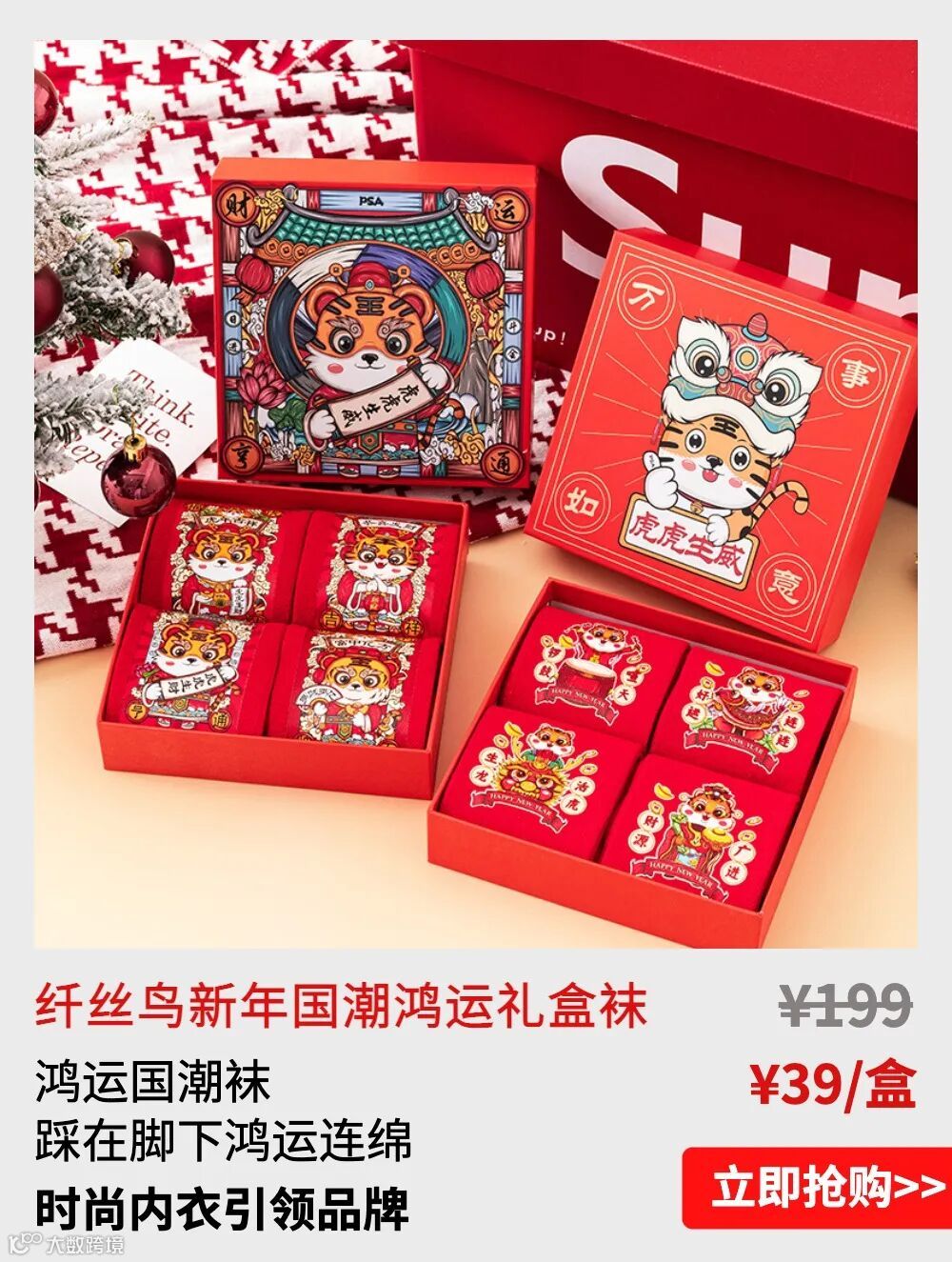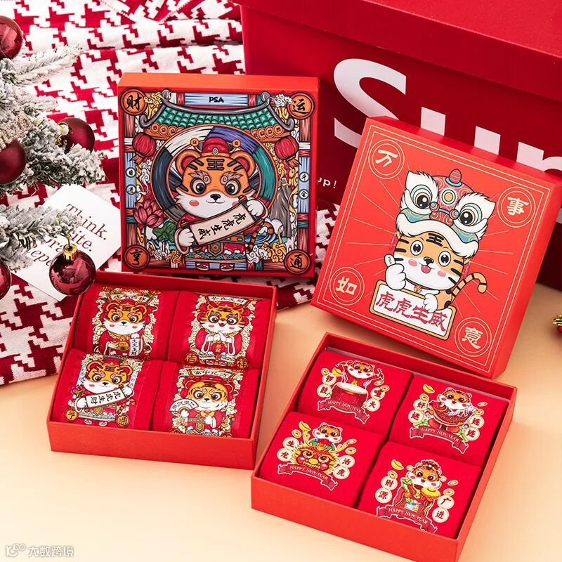这个礼盒中分为2款,4双中腰袜为一种,4双低腰袜为一种,寓意着“福运到家”“虎年开运”!