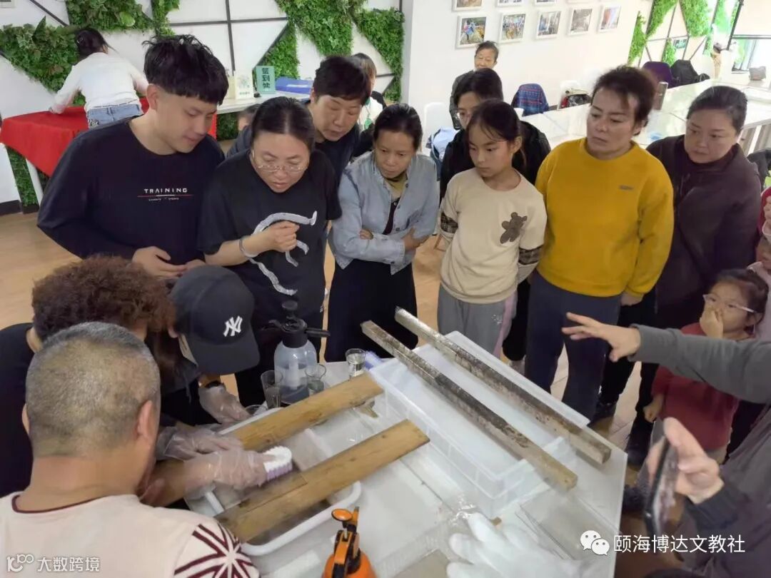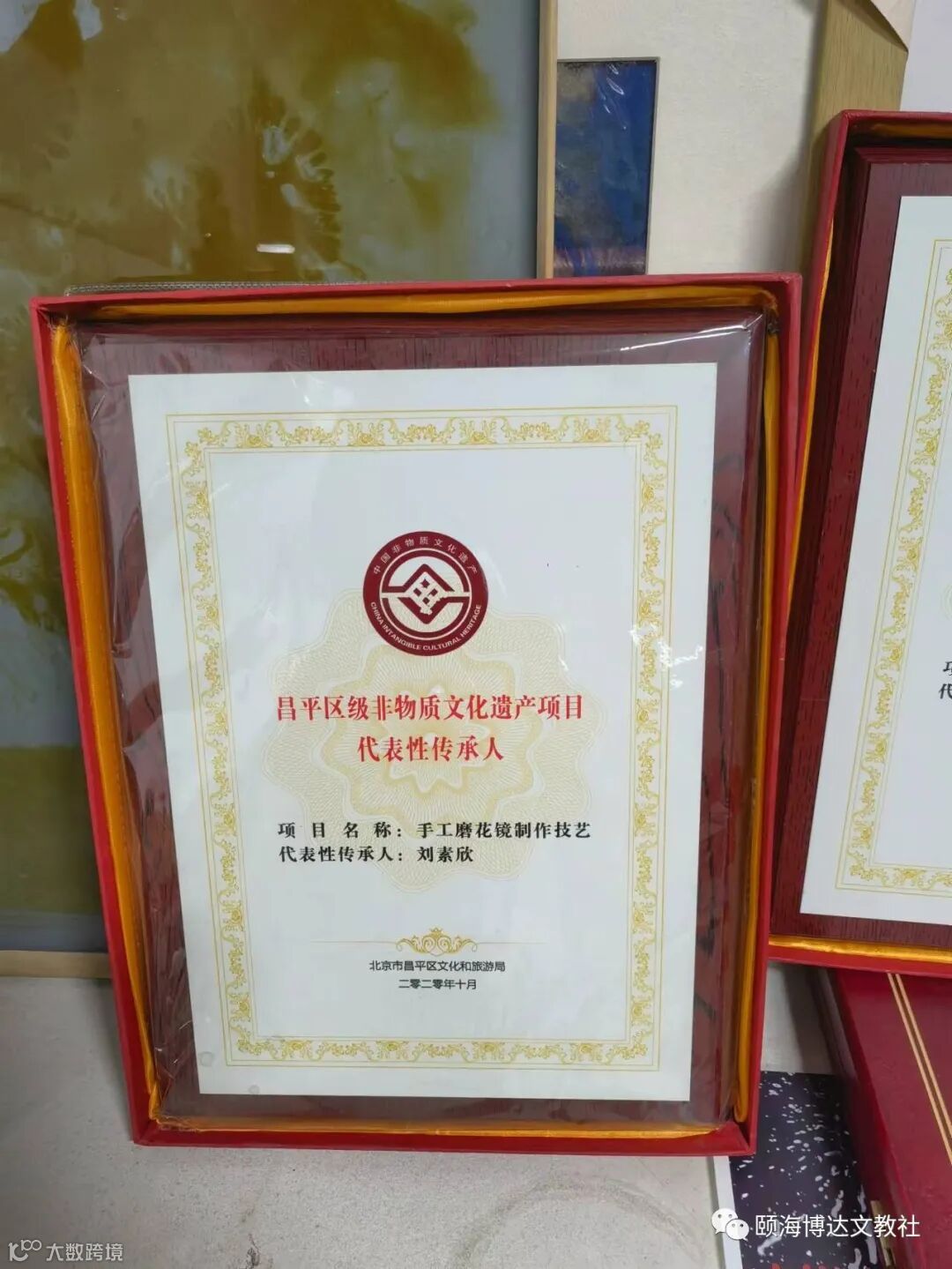 活动现场,非遗传承人刘素欣和刘迎春一起带大家制作手工磨花镜。跟着老师的教学节奏,大家利用砂轮和玻璃的接触,把点、线、面进行组合、排列、分割,从而形成花草山水、鸟兽鱼虫、人物形态等各种图案。之后经过打磨、抛光、镀银、上框,制作成了成一件件完整的花镜作品,这种镜子从正面看图案有凸出来的效果,但镜面是平整的。