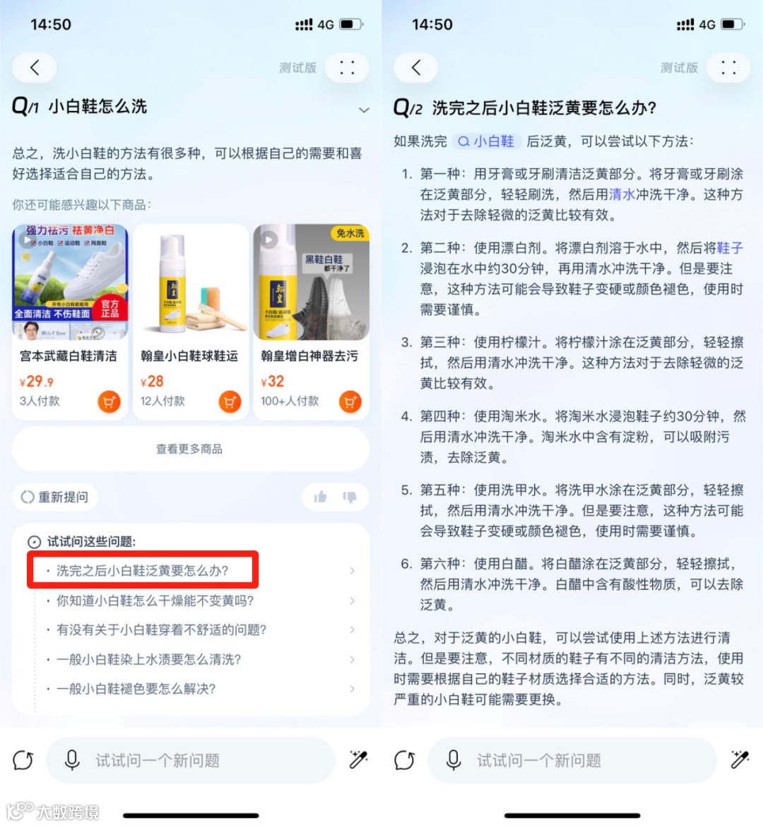 相信不少家人都遇到过小白鞋洗完之后变黄的情况,AI坐拥大数据早就替大家伙想到了,直接在页面底部的推荐提问当中继续发起提问即可。