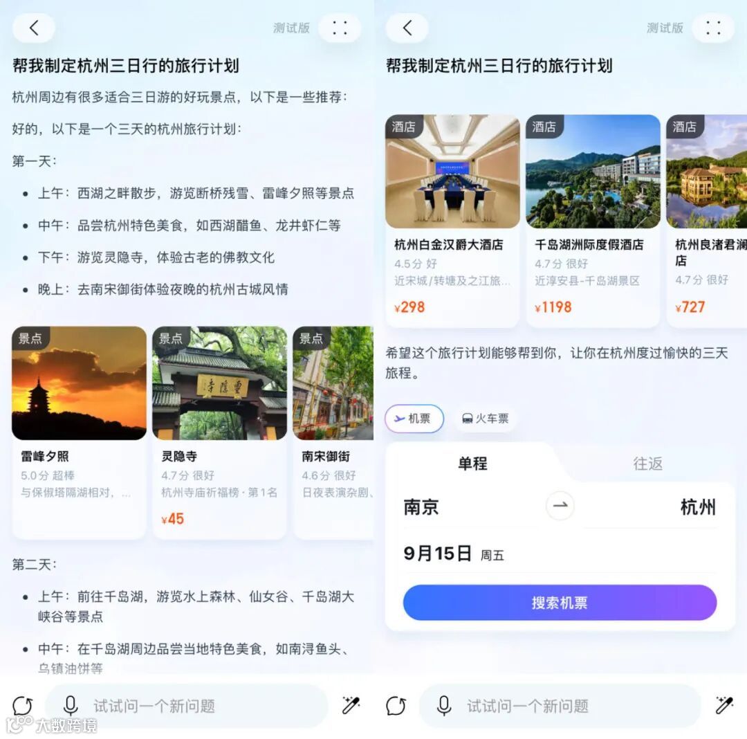在页面上,淘宝AI助手直接为消费者提供了酒店住宿与景点门票的推荐结果。你甚至可以直接在聊天对话窗口内搜索机票与火车票。